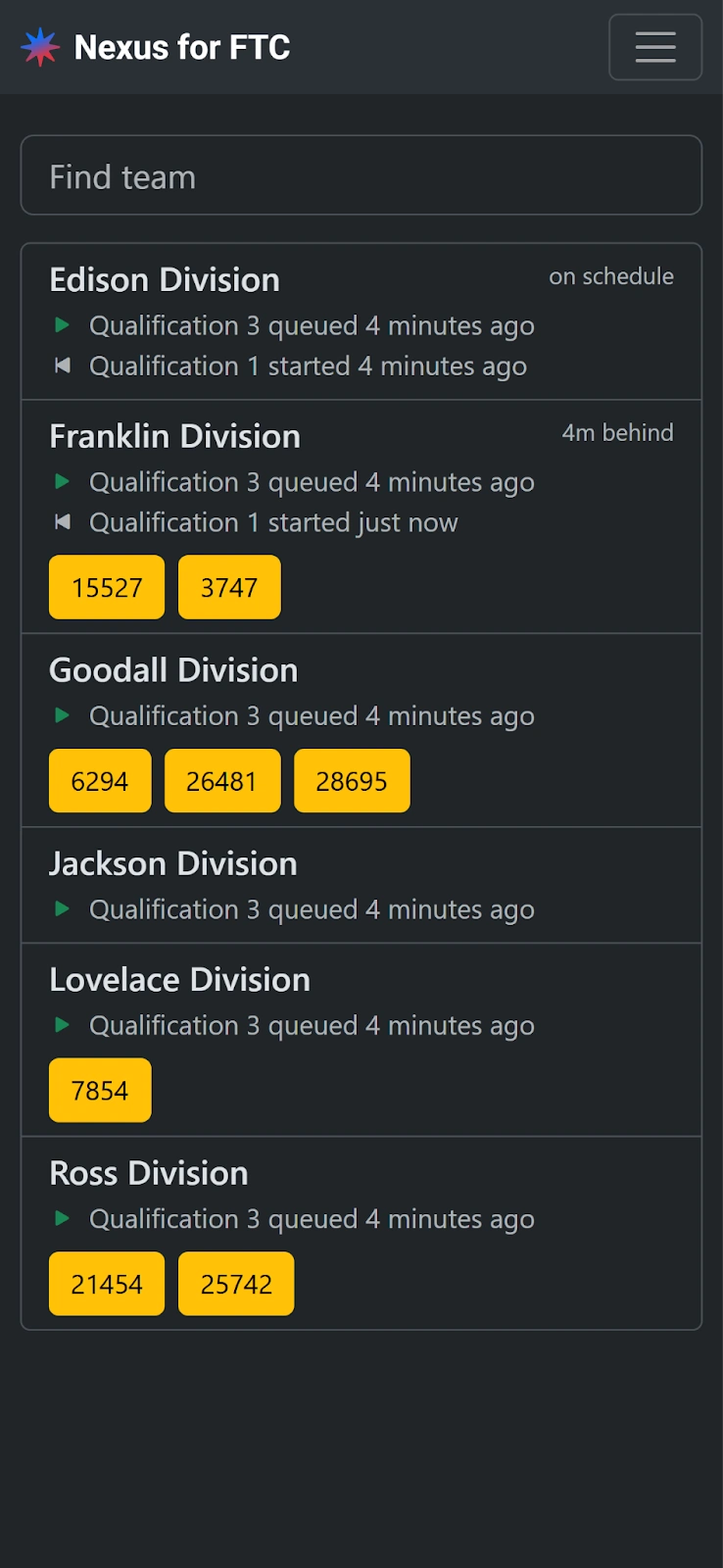 For events with 4 or more divisions that culminate in an inter-division playoff tournament, Nexus supports queuing inter-division playoff matches. Once a division’s winning alliance is entered into Nexus by the lead queuer, the alliance will automatically be added to the championship playoffs event. Notification preferences will be copied automatically, so teams do not need to sign up for notifications again. If they need to update their notifications, they can scan the Nexus code they received for their division.