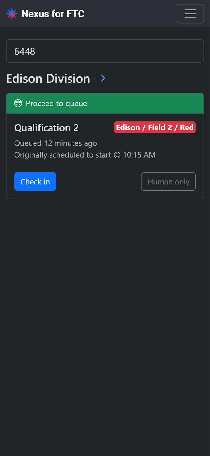 Queuers can search for a team in order to view their current queuing status and mark them as checked in.