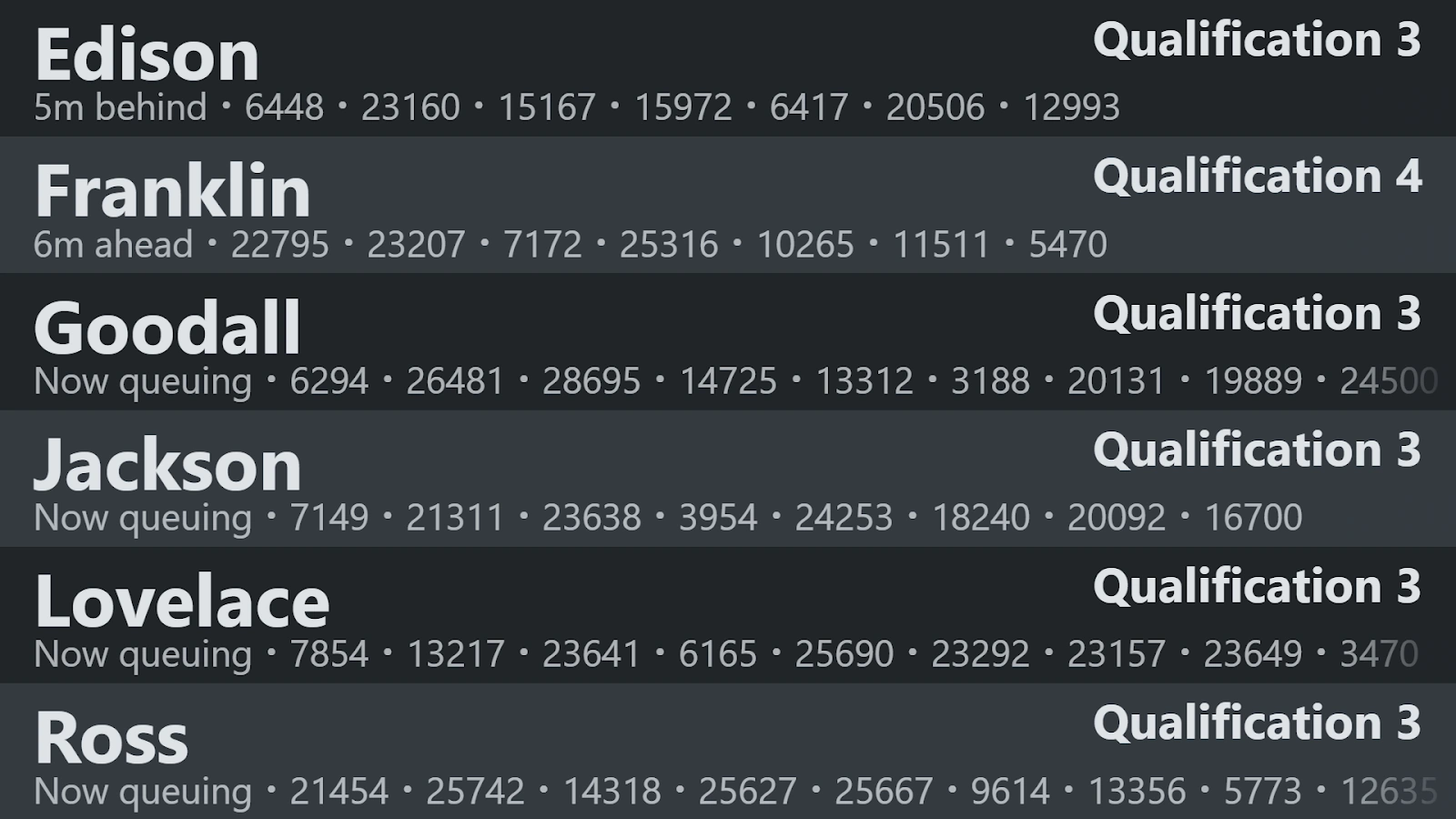 The combined queuing status display will show the queuing status for all divisions on a single screen. Teams that are queuing but not yet checked in will also be displayed for each division.